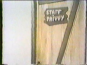 Episode #9 Air date: April 7, 1979 cast: Ian Fingler, Les Lye, Christine "Moose" McGlade, Mike Patton, Jim Stechyson, Sarah West and Jim Johnson as the DJ writers: Geoffrey Darby, Roger Price director: Geoffrey Darby The "network people" have a party and leave $20 bills behind, but when the cast finishes collecting them, Ross quickly confiscates them claiming they are "play bills." Christine, Sarah, Jim and Mike end up trying to slime and pie each other. Plus, it's Mr. Dime vs. Jim and The Janitor in the battle of the executive washrooms. This episode also featured some Billy Joel music videos. Also included in this episode is a behind-the-scenes scene of the "network show," AKA "Whatever Turns You On", and features a non-aired scene of then-director Geoffrey Darby getting a surprise pie-in-the-face. Ruth Buzzi had also been slimed and pied prior to this scene. soup: Mike green slime: Jim S, Iain, Mike & Sarah, Ruth Buzzi pie: Iain (4), Geoffrey Darby production: Staff Privvy Executive Washrooms |